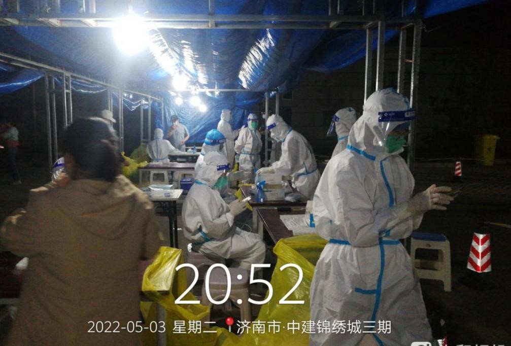 在槐蔭區(qū)錦繡睿城社區(qū)和錦繡城社區(qū),志愿團隊由劉貴武帶隊,閆春貞、李登哲、侯志強、劉欣、張現(xiàn)錄6人組成,他們兵分兩組,每天早上5點30分出發(fā),到達社區(qū)后立即開始準備核酸檢測,“請大家排好隊”、“請保持1米距離”、“請?zhí)崆按蜷_健康碼”......在核酸采樣現(xiàn)場,志愿者們穿著隔離衣,戴著口罩,這樣的提醒引導(dǎo)要重復(fù)幾百次,不一會兒就口干舌燥,但是他們堅持耐心引導(dǎo),把疫情防控放在第一位,按規(guī)定進行消殺,提醒居民保持距離,和病毒賽跑和戰(zhàn)斗,不能有絲毫馬虎和懈怠。他們一直工作到晚上近10點,每天回到住處已經(jīng)很晚了,但第二天依然按時到達社區(qū)。劉貴武說,“醫(yī)務(wù)工作者和社區(qū)工作者比我們堅守的時間更長,他們更辛苦!我作為一名預(yù)備黨員,槐蔭隊的隊長,更應(yīng)該沖鋒在前,帶領(lǐng)大家圓滿完成任務(wù),接受黨組織的考驗。”